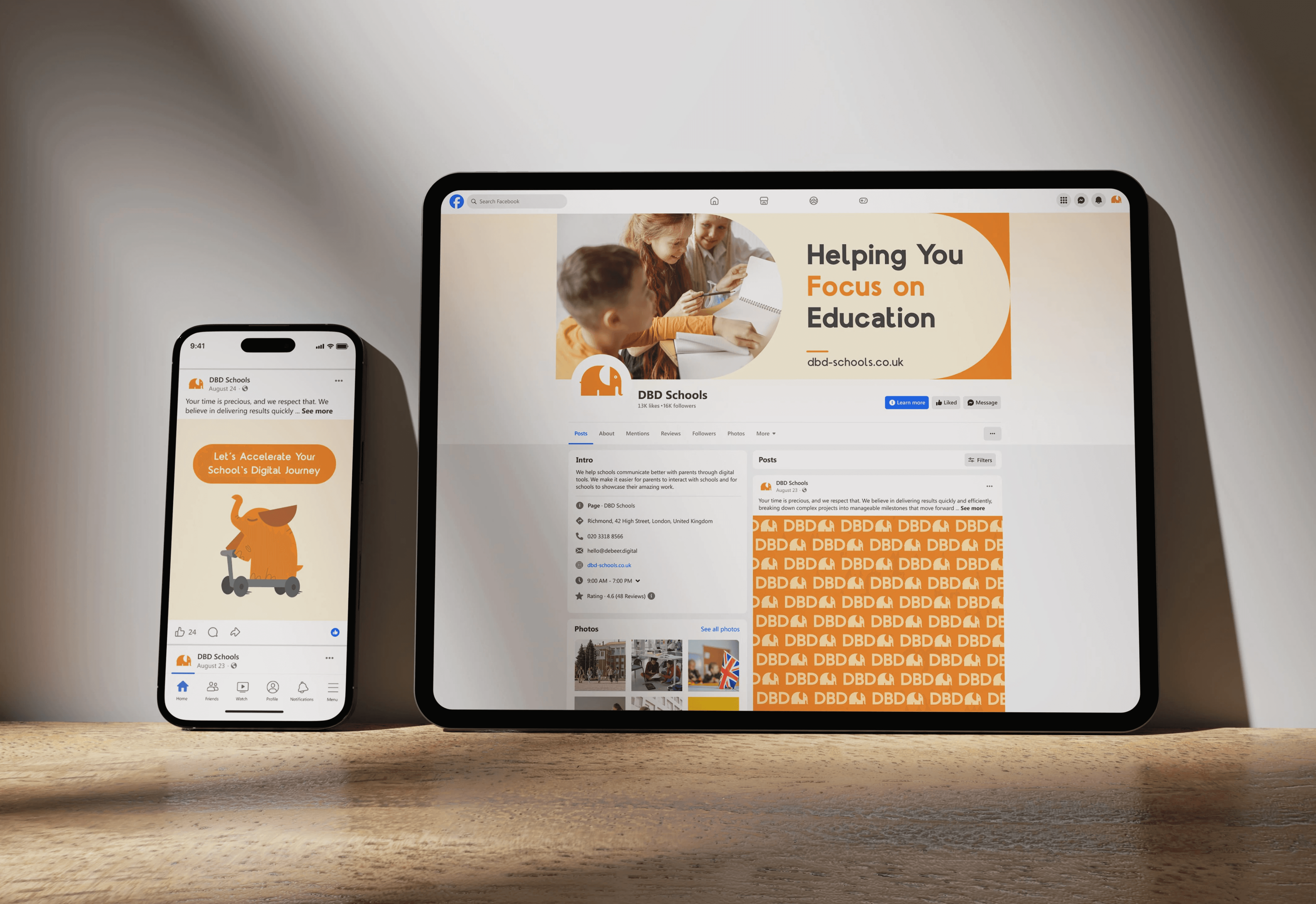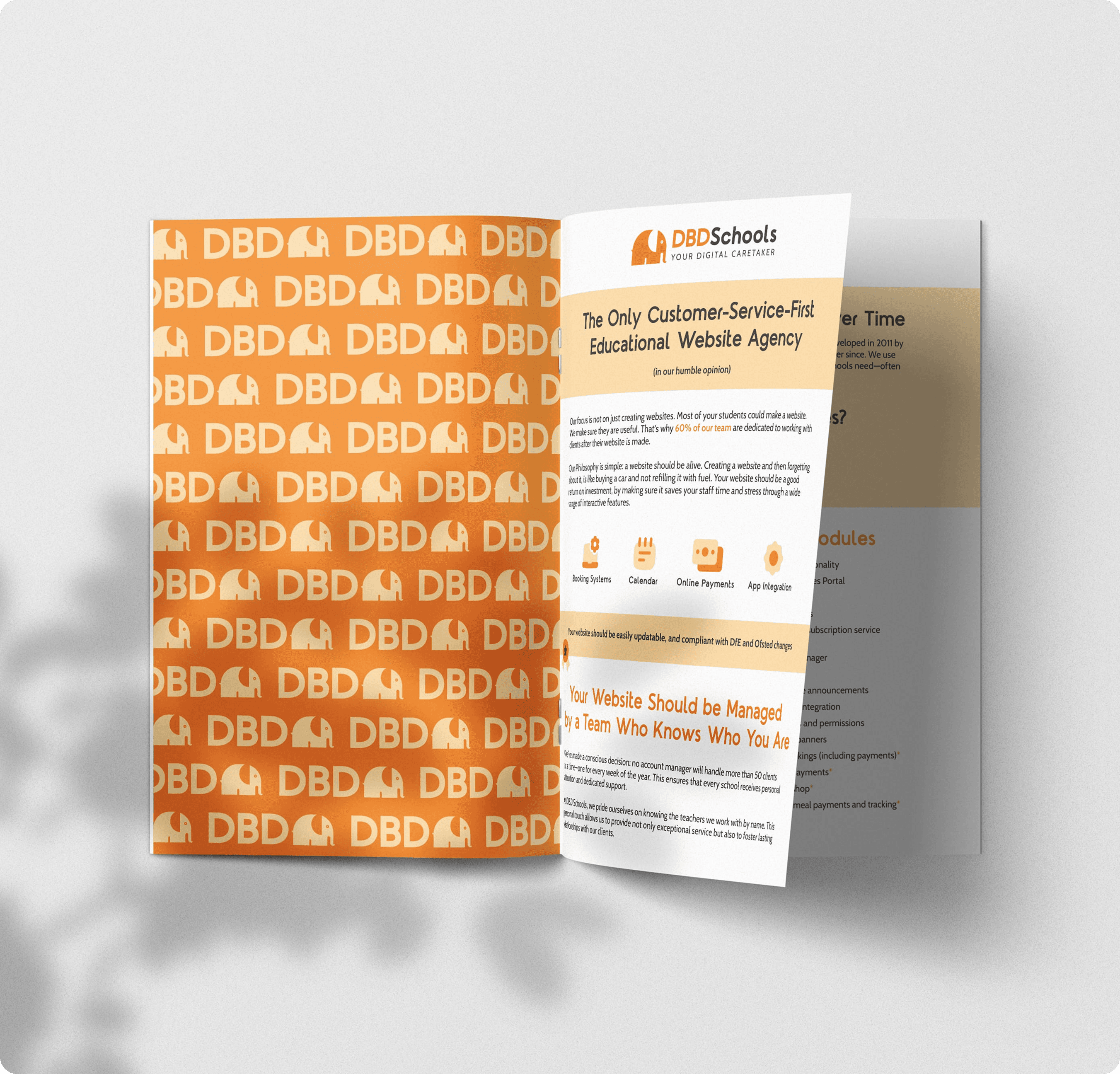 The company had a strong service philosophy, but needed a brand that could carry it into schools and make it feel real. We built everything around one idea: websites need care, not just design. DBD Schools became a digital caretaker. A partner that quietly works in the background so schools can focus on education, not website maintenance. The elephant became the brand identity and mascot. It represents care, reliability, strength, and memory — everything DBD Schools does for schools over the long term. Unlike the abstract icons competitors use, the elephant creates instant recognition and emotional connection without feeling childish or unprofessional. The visual system balances warmth with structure. Bright orange brings energy and approachability. Subtle patterns like elephant footprints reinforce the message: "Small Team, Big Footprint." Meaning the impact that a small DBD Schools team can deliver.