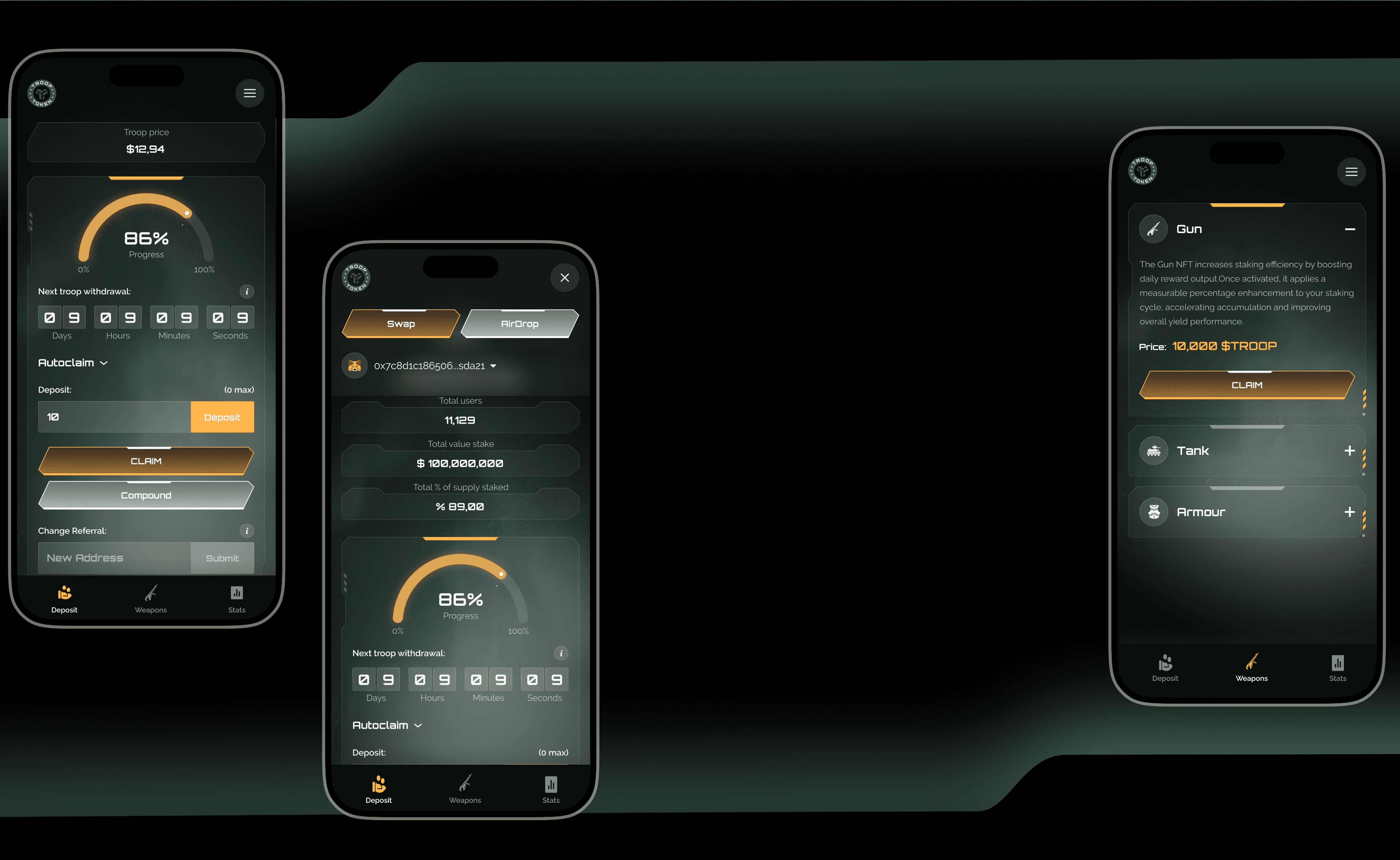 We treated the product like a game, because functionally, that's what it is. The interface translates Web3 complexity: staking, compounding, rewards, and referrals into visual progress systems. Timers, status indicators, and percentage-based progress bars make value accumulation and reward cycles instantly readable. Users don't need to calculate. They just see it. NFTs weren't positioned as collectibles. They're functional power-ups. Weapons, armor, tanks — each one directly influences staking performance. The relationship between upgrades and rewards is clear and immediate, reinforced consistently across layout, iconography, and interaction patterns on desktop and mobile. For social media, we developed a set of branded creative assets using military-inspired visual language. These banners and visuals supported announcements, private sale communication, and early user acquisition, ensuring the product experience and external presence felt like they came from the same world.
