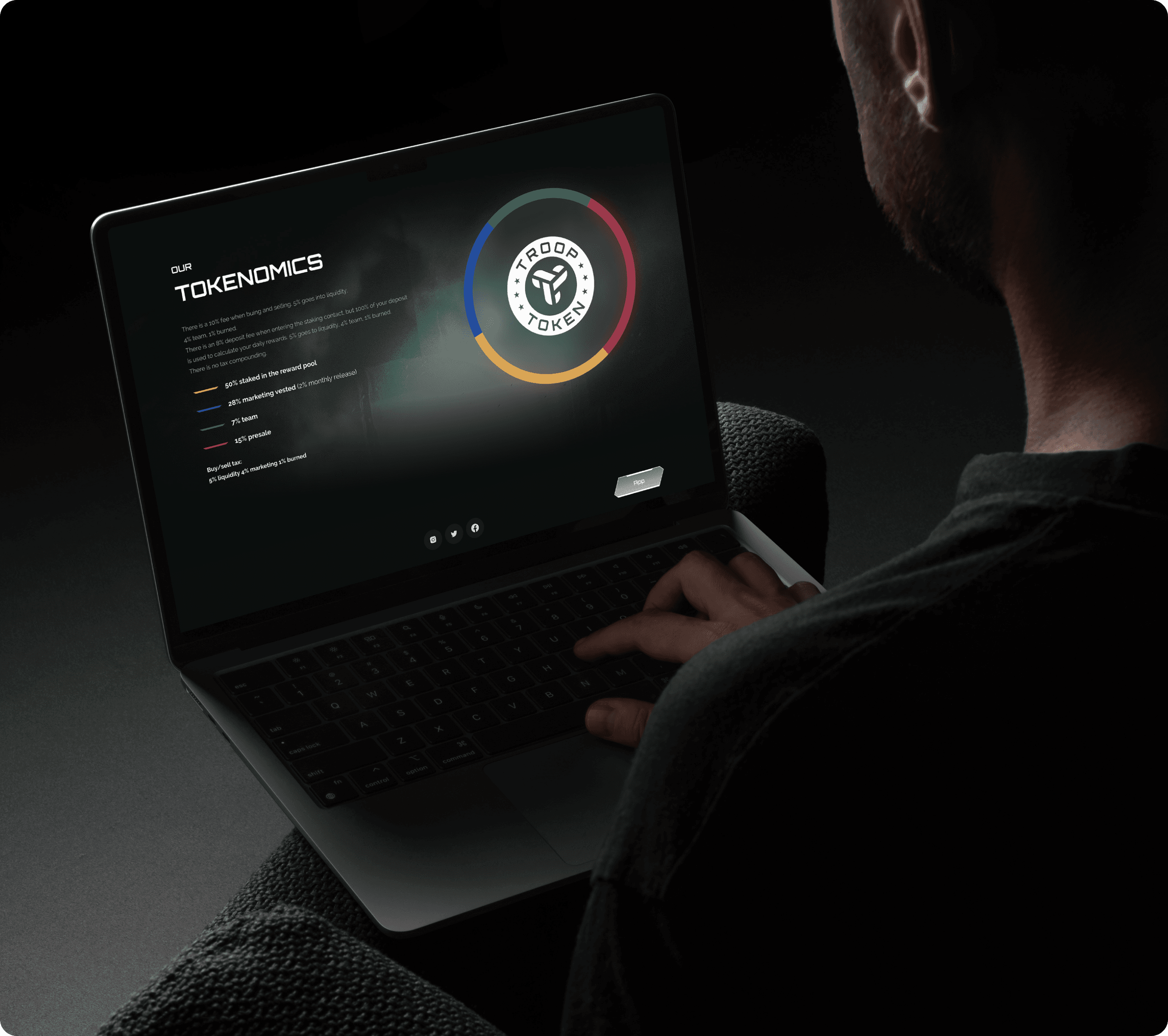 Troop Token wasn't one feature. It was four interconnected systems: A staking dApp with daily rewards NFTs that function as gameplay power-ups A referral mechanism A future play-to-earn game layer Each piece had to work individually and collectively. The product needed to clearly communicate value, progress, and rewards without overwhelming users who'd be interacting with it daily. At the same time, the project needed strong, recognizable visual assets for social media to support the private sale and build early community momentum. The brand had to feel cohesive across the product and every external touchpoint.
