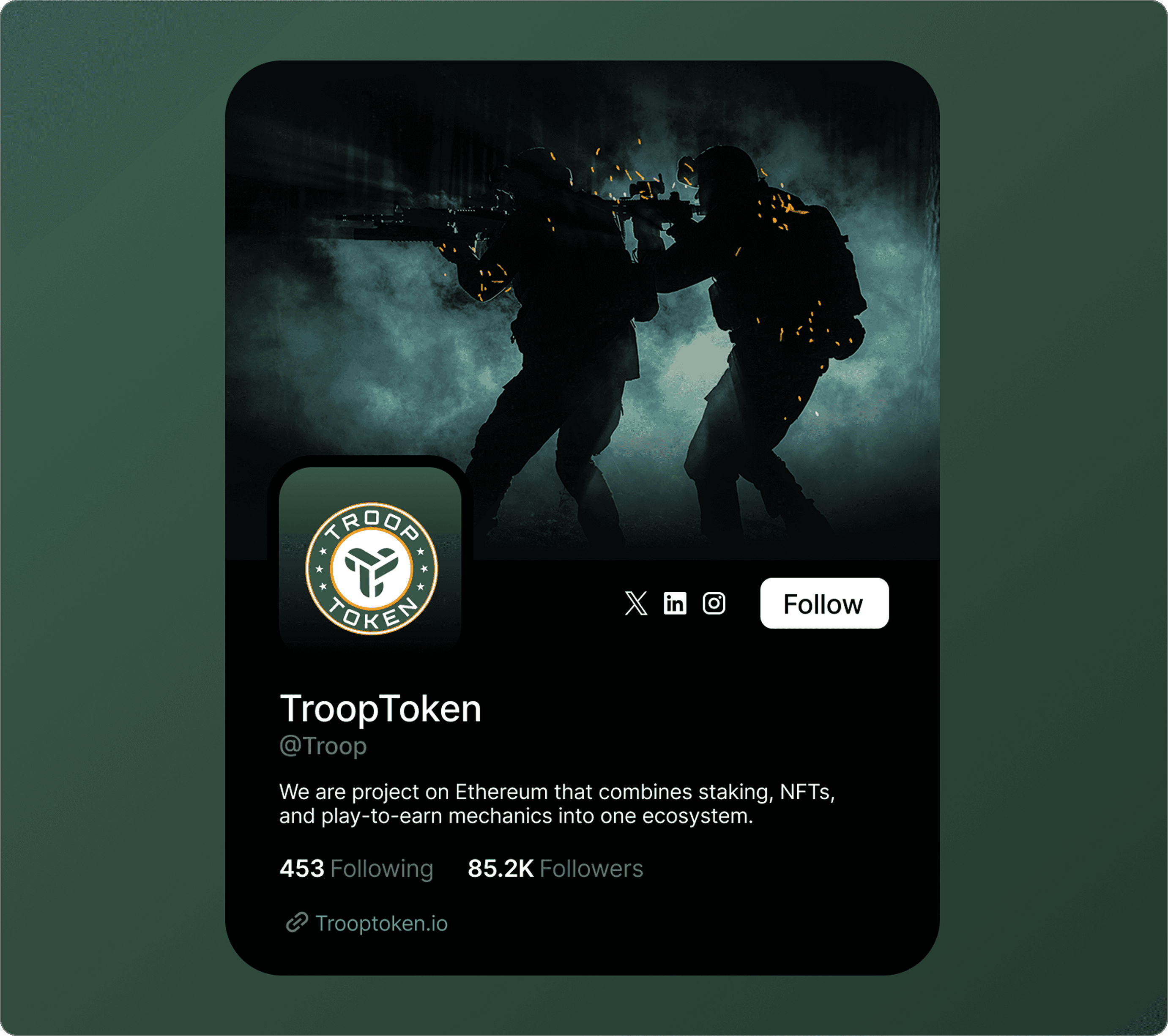 Troop Token is a Web3 project on Ethereum that combines staking, NFTs, and play-to-earn mechanics into one ecosystem. It rewards long-term participation through daily staking returns, NFT-based power-ups, and referral systems. It's built for crypto-native users who want an engaging, game-like investment experience, not another sterile DeFi dashboard.